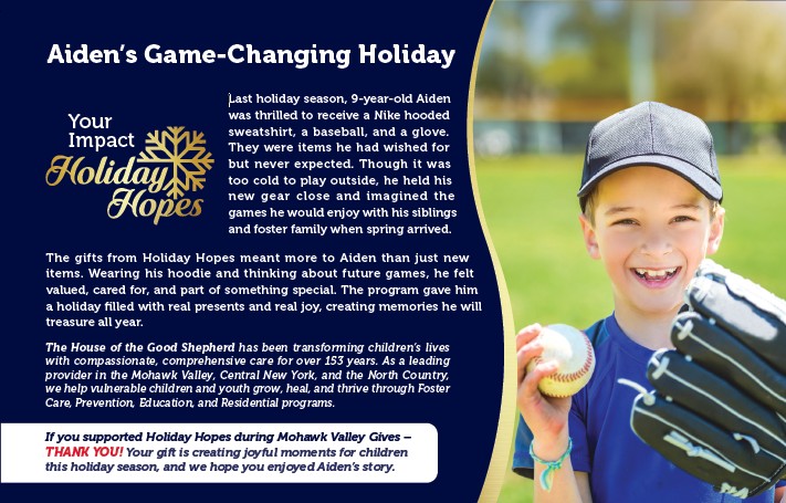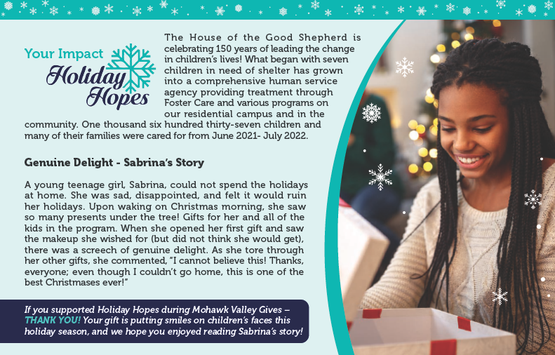 The Holiday Hopes Gift Campaign provides children and their families with gifts, necessities, and meals. Thanks to Holiday Hopes Heroes like YOU and your outpouring of support, we can reach our goal and provide a holiday experience full of joy for children and families! This season, we aim to provide holiday cheer to almost 600 children and many of their families. Please help us make the holiday season magical by donating today!