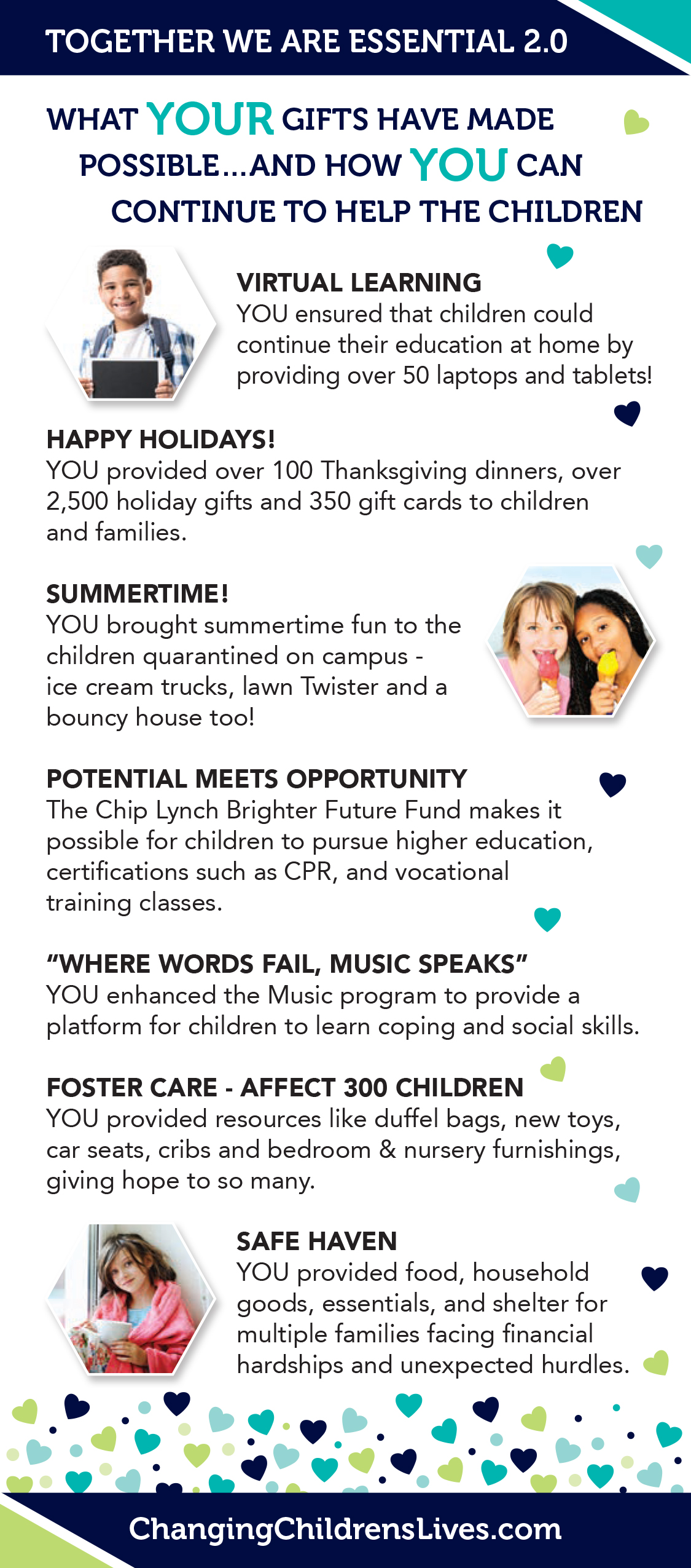 Last year, was a year of uncertainty, angst, and stress. Our agency faced many challenges to keep children, staff, families, and our community safe. While this meant canceling visitation from family members and other safety measures, because of your financial support, we were able to ease the stress of separation by providing activities, education, and technology. Here are just some of the ways YOU HELPED!